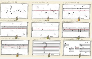 - Draw a red line though the middle of it and label it C (like a harp string). Move a few dots on the board so some are smack on the C line. Ask the students to go and make what they see in sound. (30 seconds max)