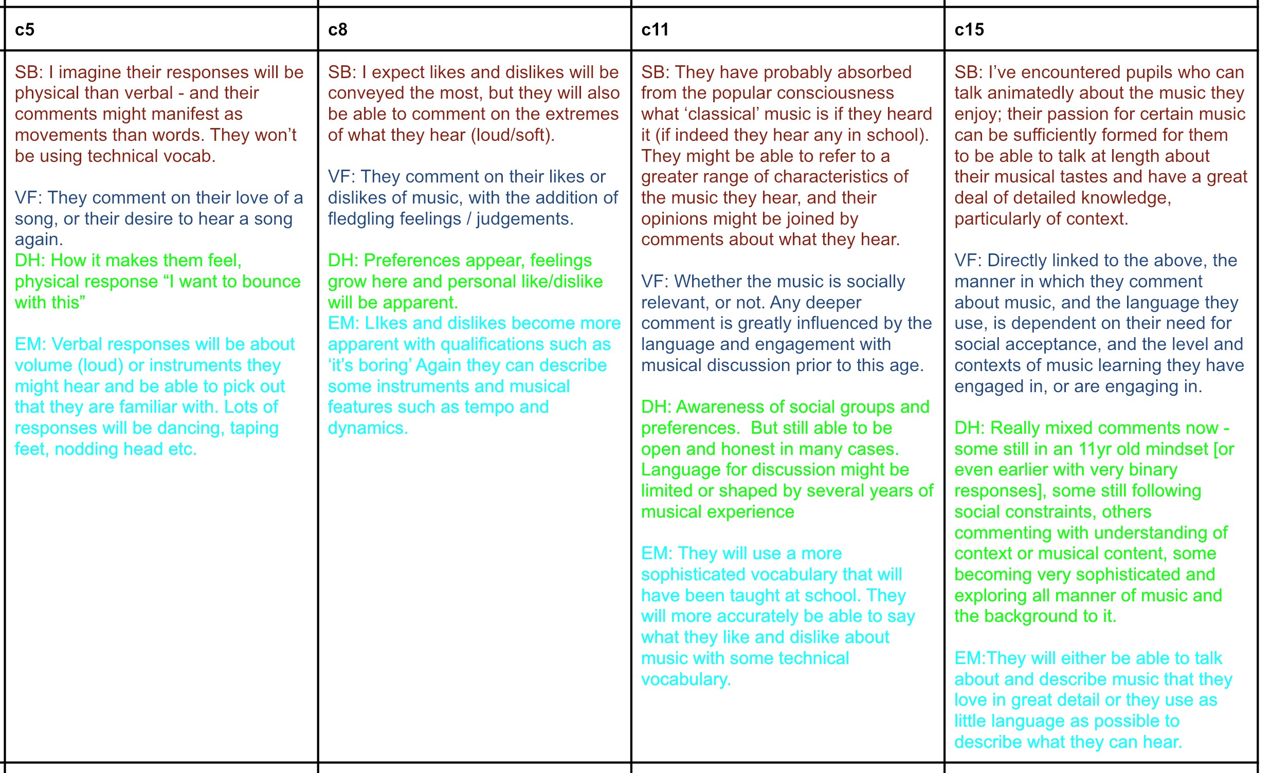How does musical knowledge develop? For the ages below what is your intuitive sense of how musical knowledge, learning and engagement will manifest in young people?