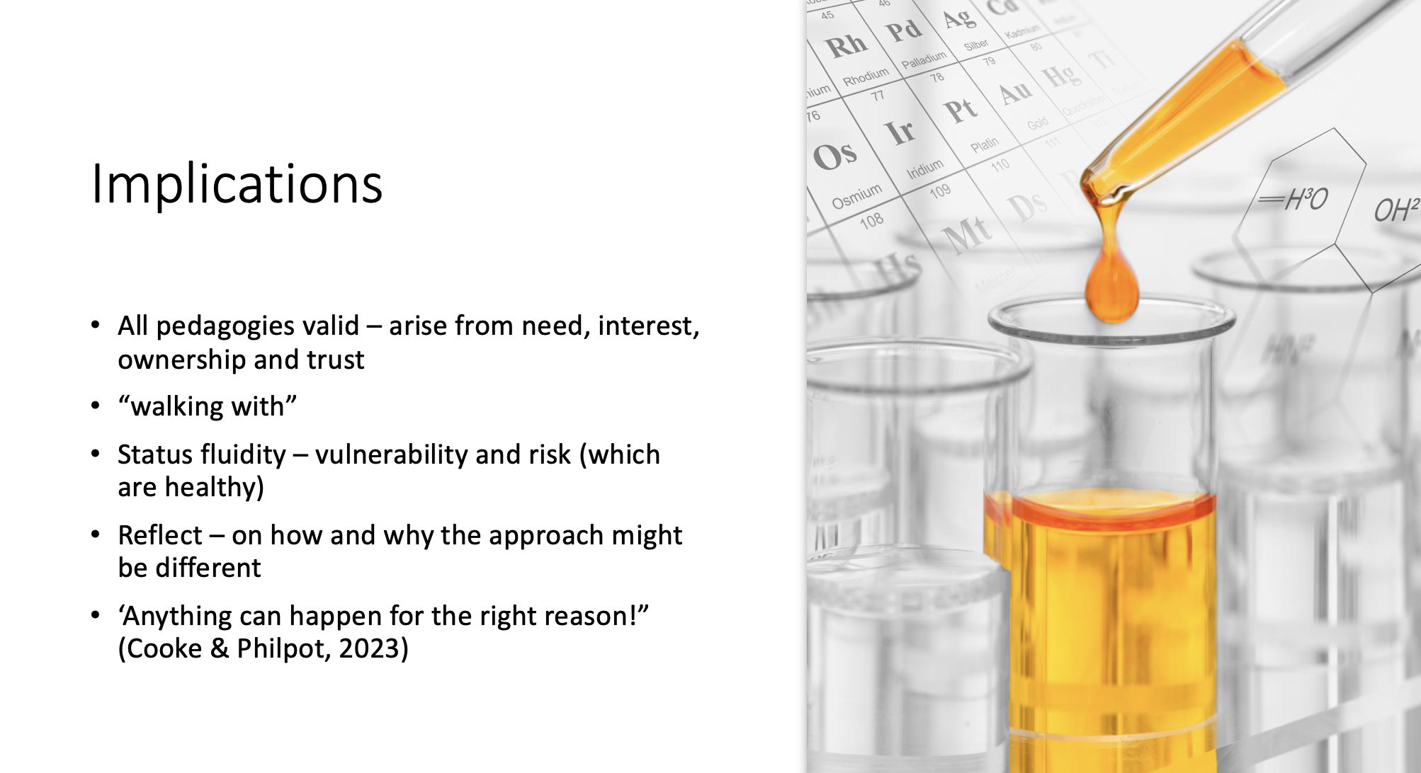 My session ended wrapping up all the conversations, fuelled by the helpful thinking of Cooke and Philpot, reflecting on the validity of a spectrum of pedagogies and the need for teachers to be vulnerable and accept healthy risk. Trainees were risk-averse. They saw strength in teachers leading, but they reflected on their own moments where teachers afforded them the necessary decision-making opportunities in their education.